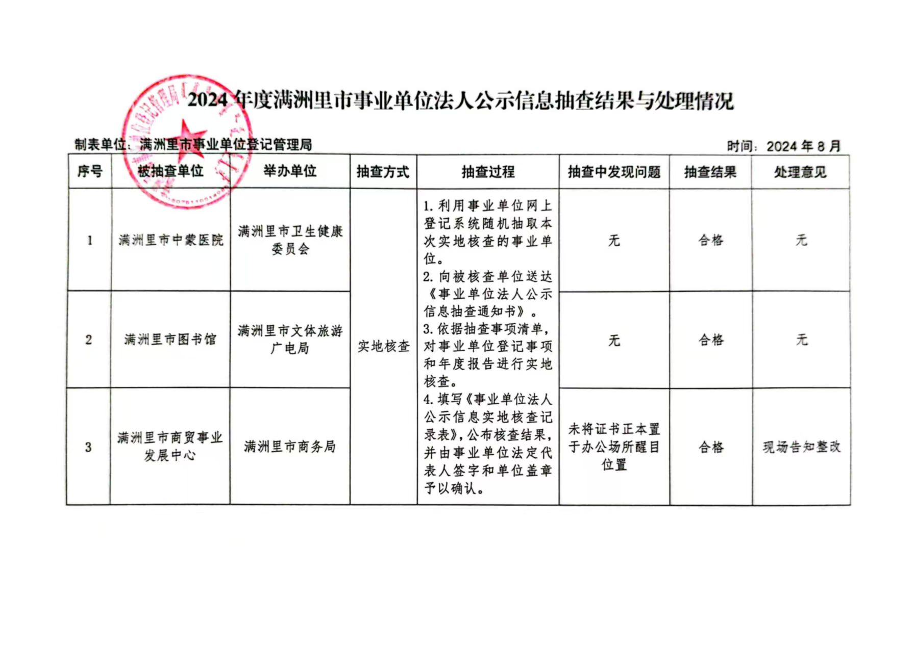 2024年度满洲里市事业单位法人公示信息抽查结果与处理情况