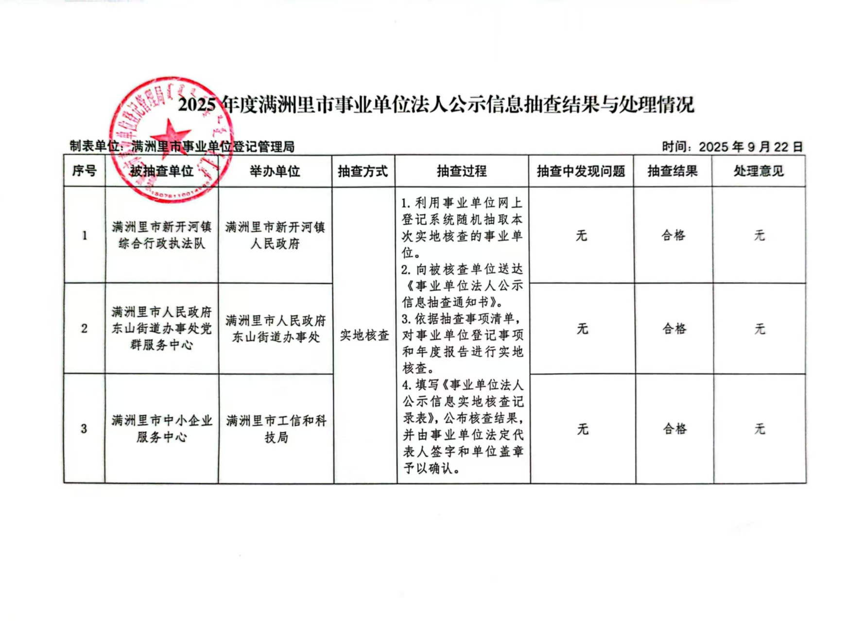 2025年度满洲里市事业单位法人公示信息抽查结果与处理情况